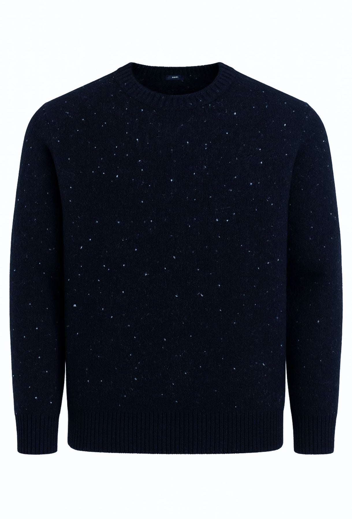 Il design melangiato con puntinatura a contrasto esalta la profondità del colore blu navy, rendendo il maglione unico e moderno.