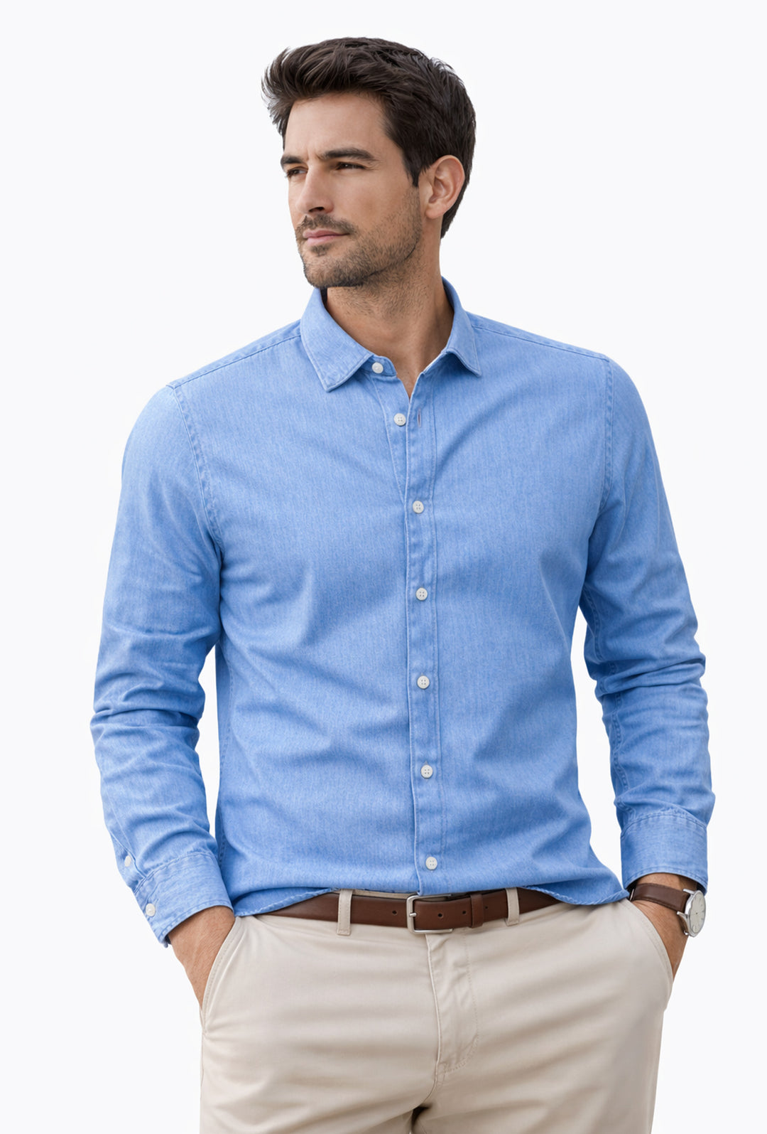 Camicia uomo Jeans manica lunga leggera semi slim fit - CELESTE
